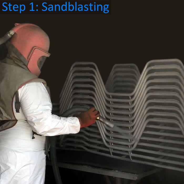 Sandblasting Patio Furniture – The blasting process removes old paint and corrosion, preparing the frame for repainting.